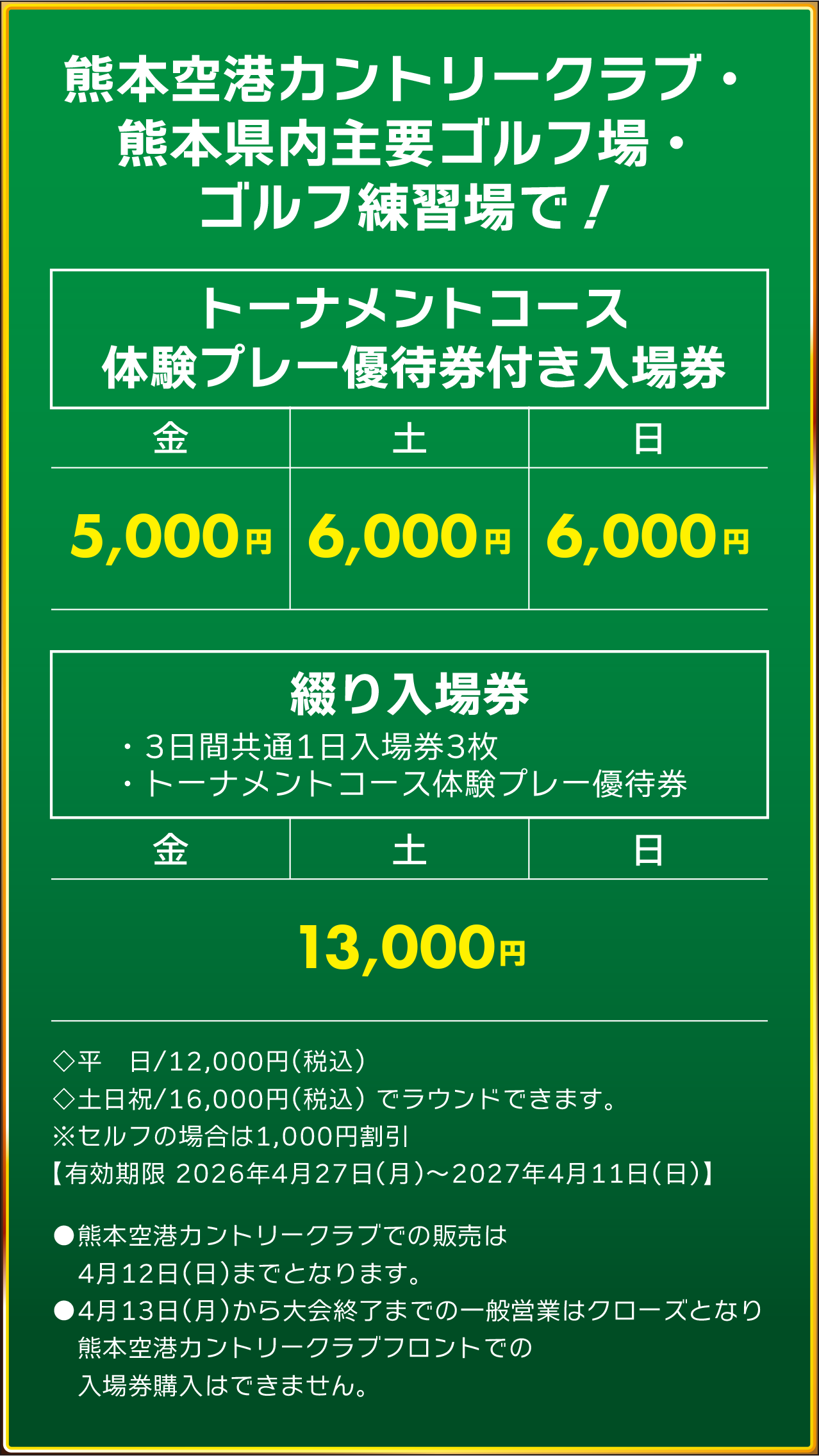 ④綴り入場券(3日間共通1日入場券3枚+トーナメントコース体験プレー優待券) 13,000円