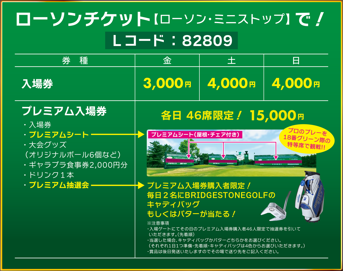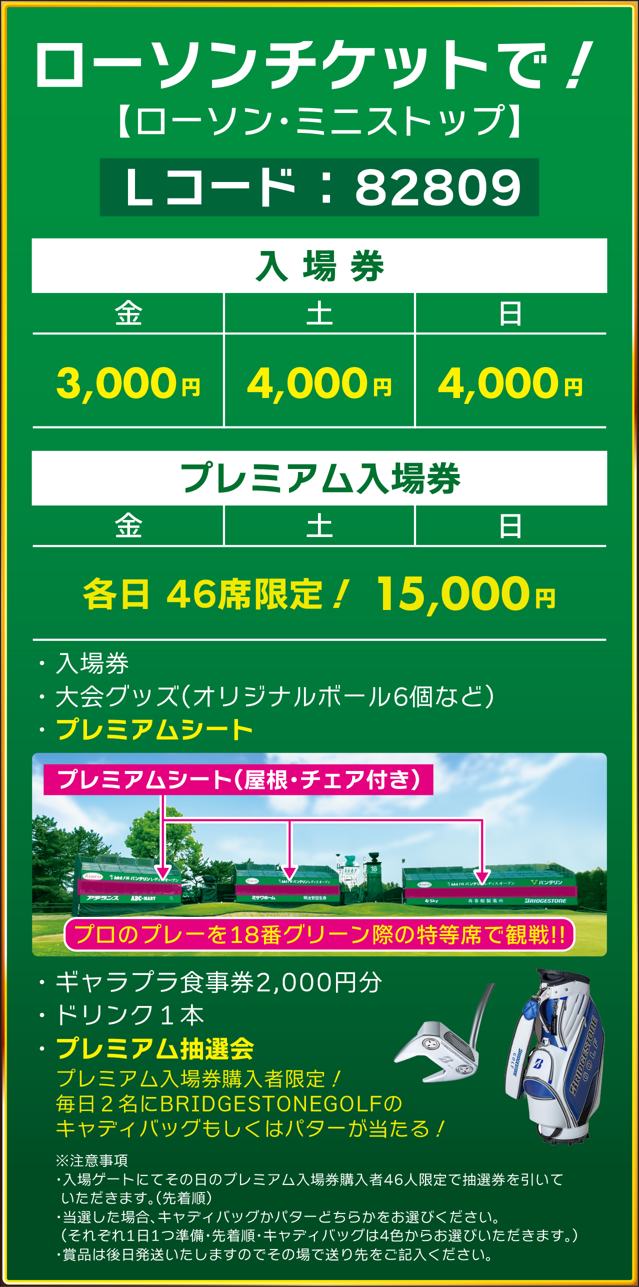 ●綴り入場券は悪天候等で競技が中止となった場合を除いて一切払い戻しは致しませんのでご了承ください。払い戻しとなった場合はお買い求めになったところで払い戻しを受けてください。但し「トーナメントコース体験プレー優待券付き入場券」、「綴り入場券」はすべてが揃っているもののみ払い戻しの対象となります。